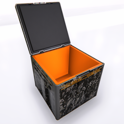 Crate of cubic shape done with military/sci-fi style. Dimensions (in opened state): 0.8m wide, 1.5m height, 1.1m depth.
