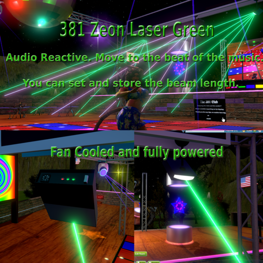 381 Zeon Laser. Driven by music in scene. Best Vol 70% Sinespace and then set down in windows mixer. Laser beam length can be set and stored on database so your lazers always stey the way you set them.