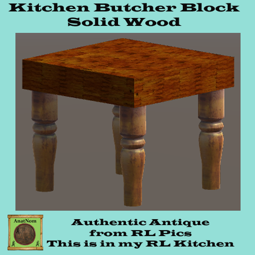 Antique Butcher Block - Solid Wood Scale Allowed Model was made from RL pics of this block that sits in my RL Kitchen Stout Legs to hold the heavy block up. There is even an old meat clever mark on the surface where it was stuck in the same spot !