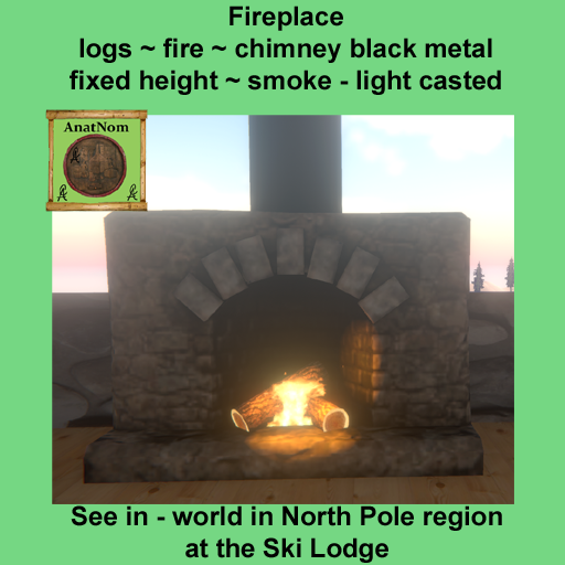 Stone Fireplace with oval black metal chimney fixed height, logs, smoke, fire, light halo casted