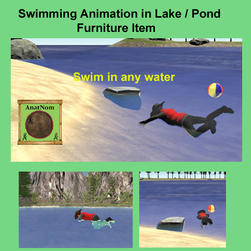 Go swimming by the rock. Swimming Pose that loops until exit. Place back of rock right at shore line with the rock out in water & the beach ball out in the water. Also the top of rock very slightly above the water line. Rotate and alighn the Beach Ball directly away from shore, ball about 1/2 submerged. Minor adjustments may be necessary to fit your lake. Raise up & down to have face just above water. Also needed is a fair sized lake or pond to place it in.