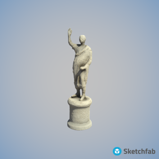 This cast statue has a modern marble base, small head and unpronounced features. Hair is visible at the back of his head but the front is bald. His right hand is raised, his left forms a fist. He is wearing a toga, tunic and boots. His toga is draped over his left shoulder and falls down the left side of his back. It crosses over the front and underneath his right arm. Firing defects cover the body. The face is crudely executed and his left eye has not been cast. A repair is visible above the knees. The stance of the man indicates he was of senatorial rank.