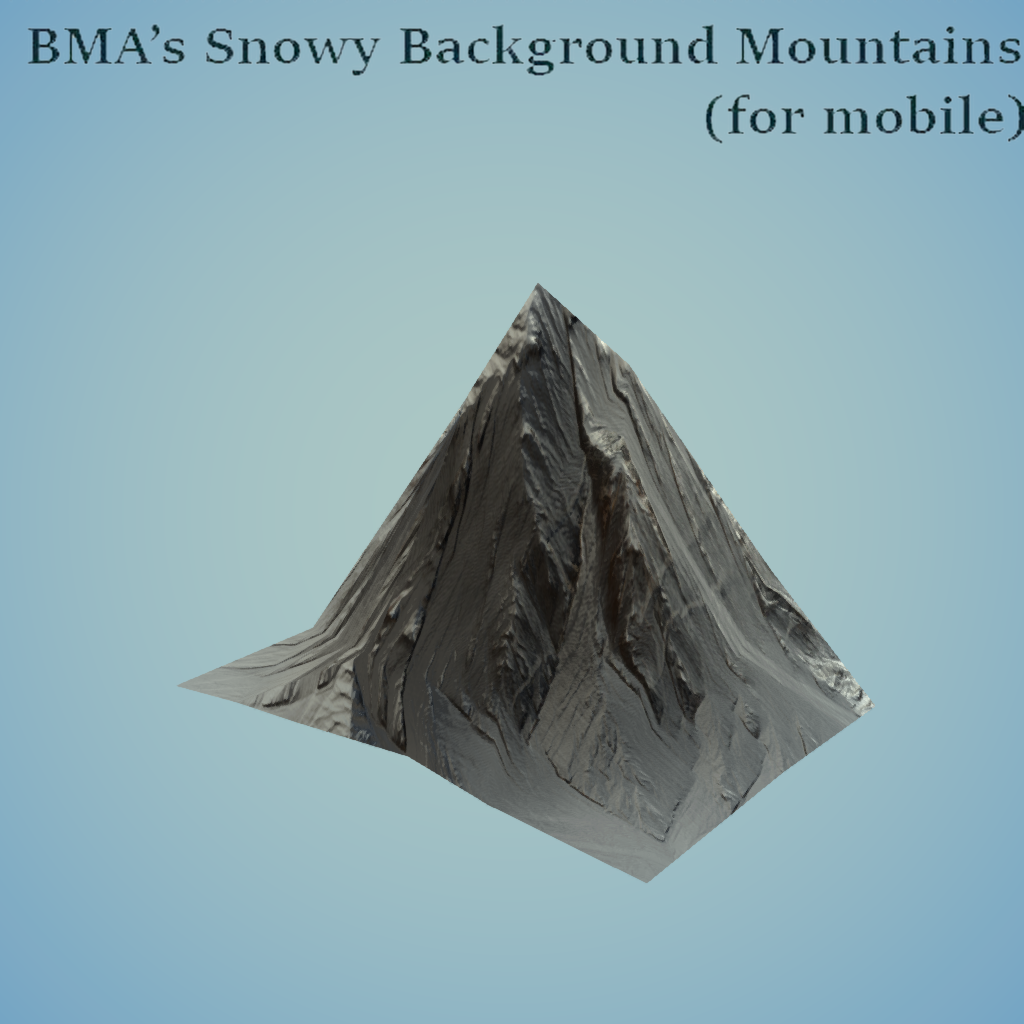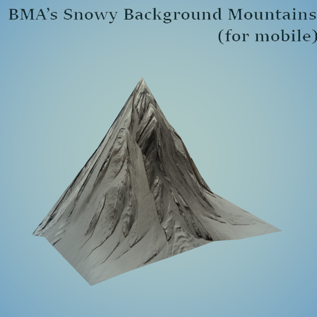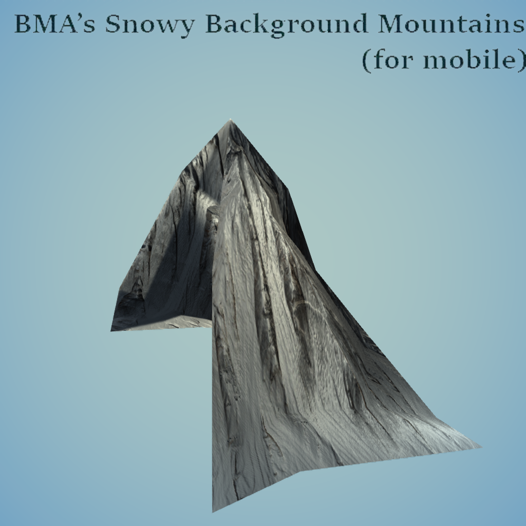 From the "Mobile Background Mountains - Snowy" Collection. These highly detailed and low poly snowy mountains can be used to extend or surround your custom environment. You can easily create unique backgrounds by simply combining different mountains. Search for BMA Assets in the Furniture tab for more items from this collection.
