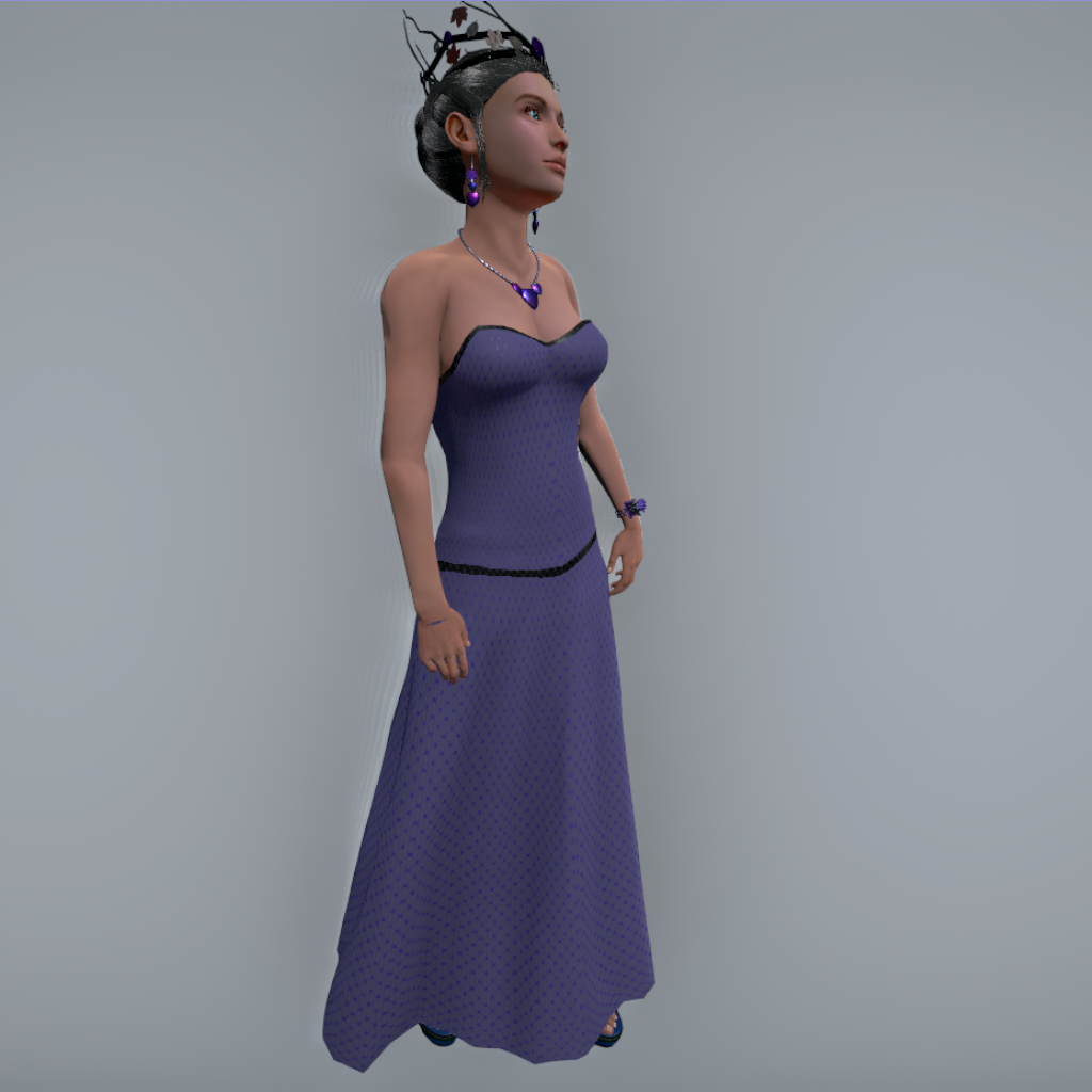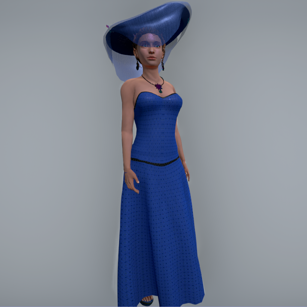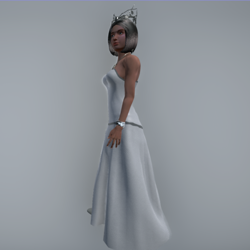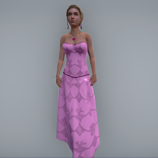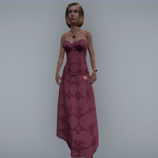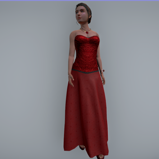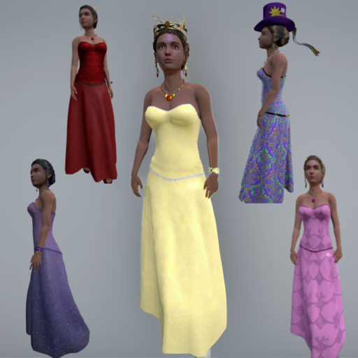 Strapless Evening Gown with figure-hugging corset and trim. Rigged, with flowing long skit.