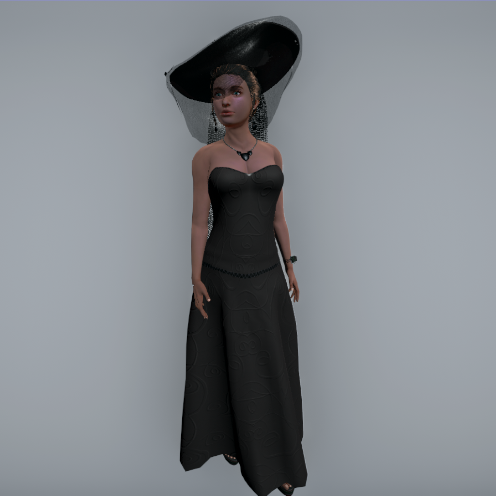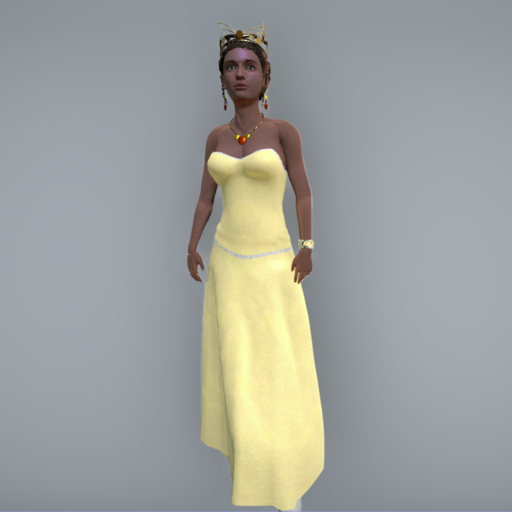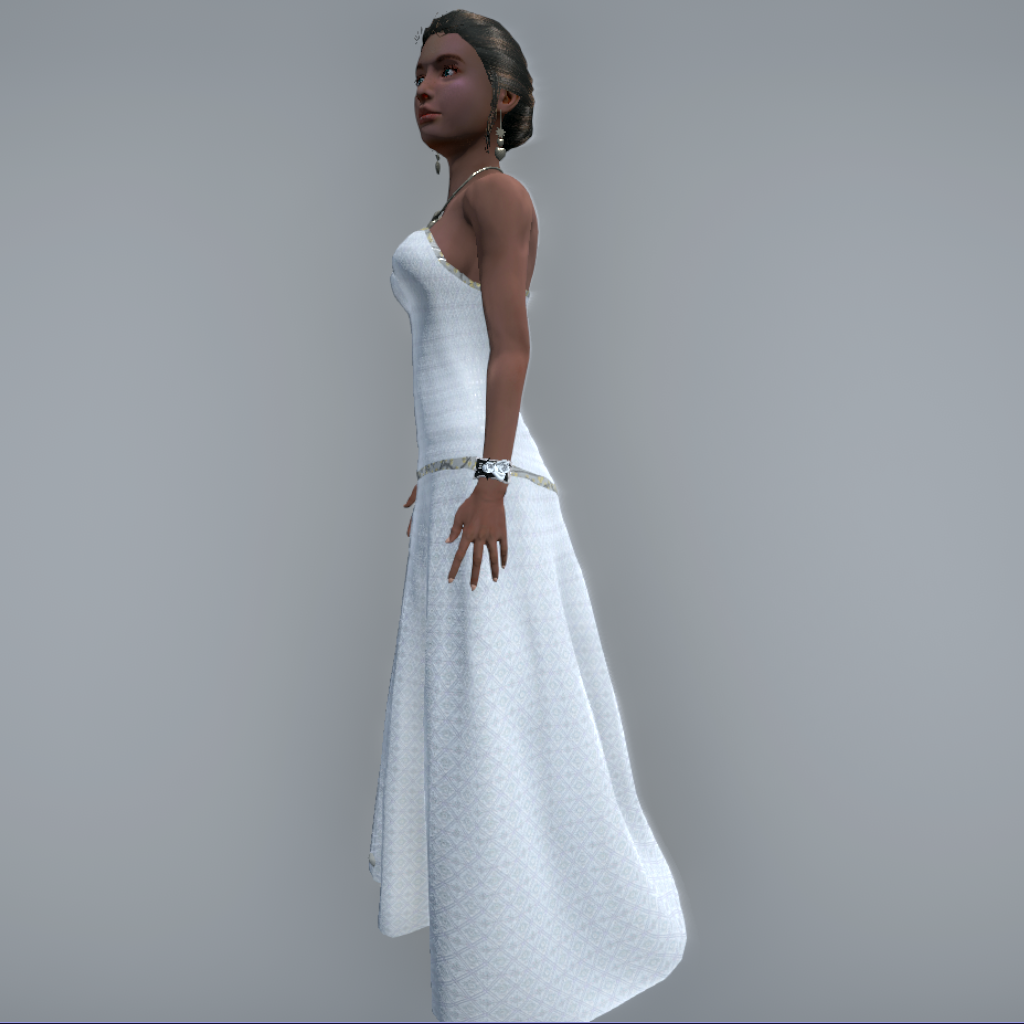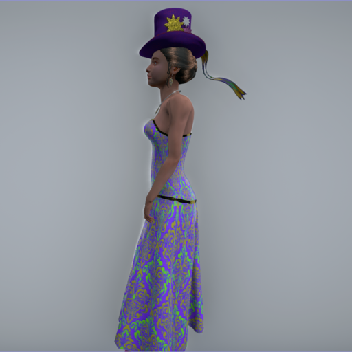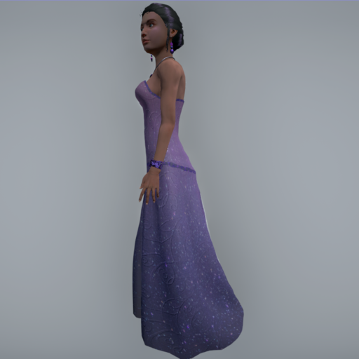 Strapless Evening Gown with figure-hugging corset and trim. Rigged, with flowing long skit.